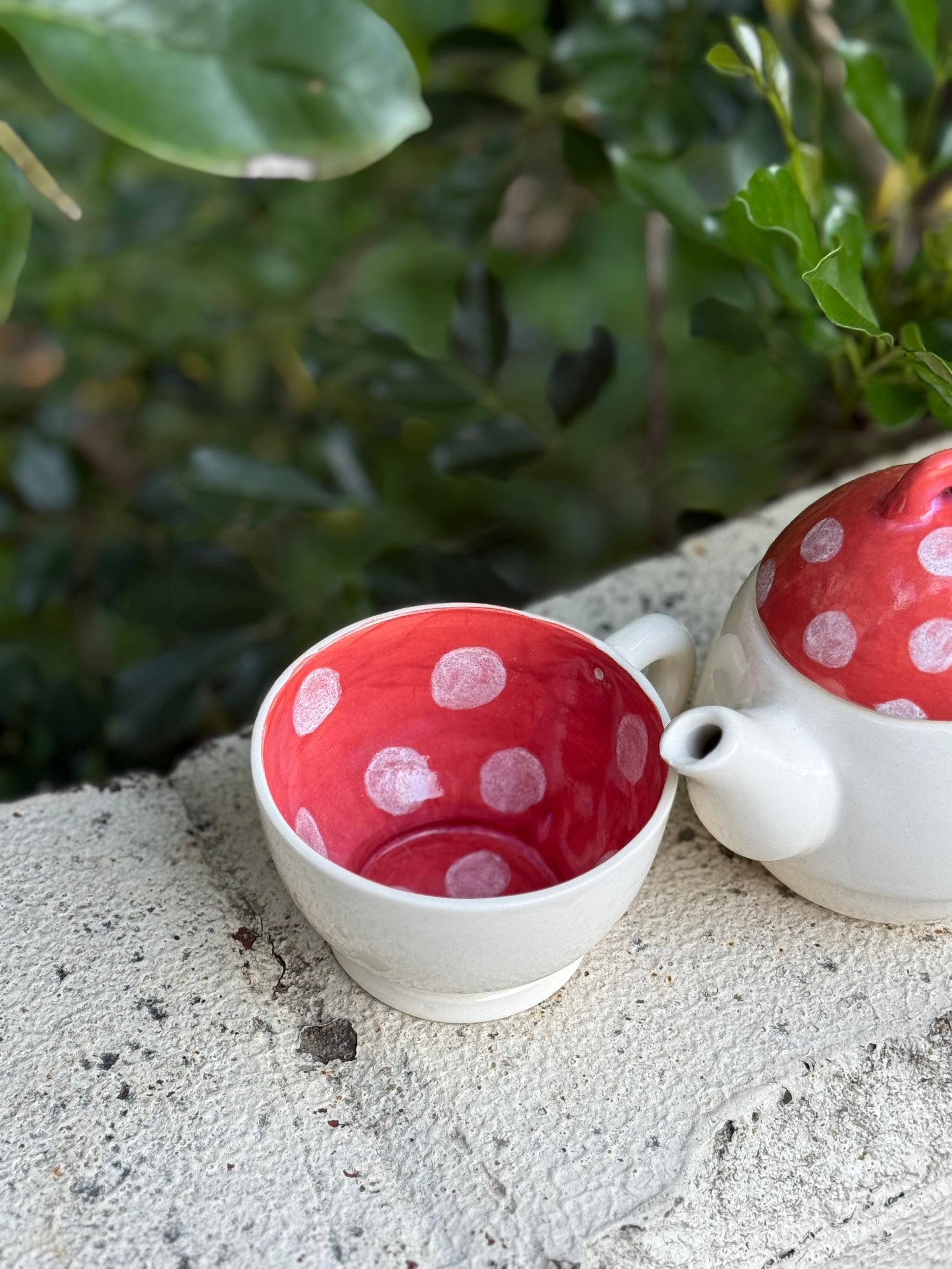 Tea for one anyone? Looking like a chubby mushroom when stacked together you take off the teapot to reveal a mushroom lined tea cup to drink your concoction from 🍄